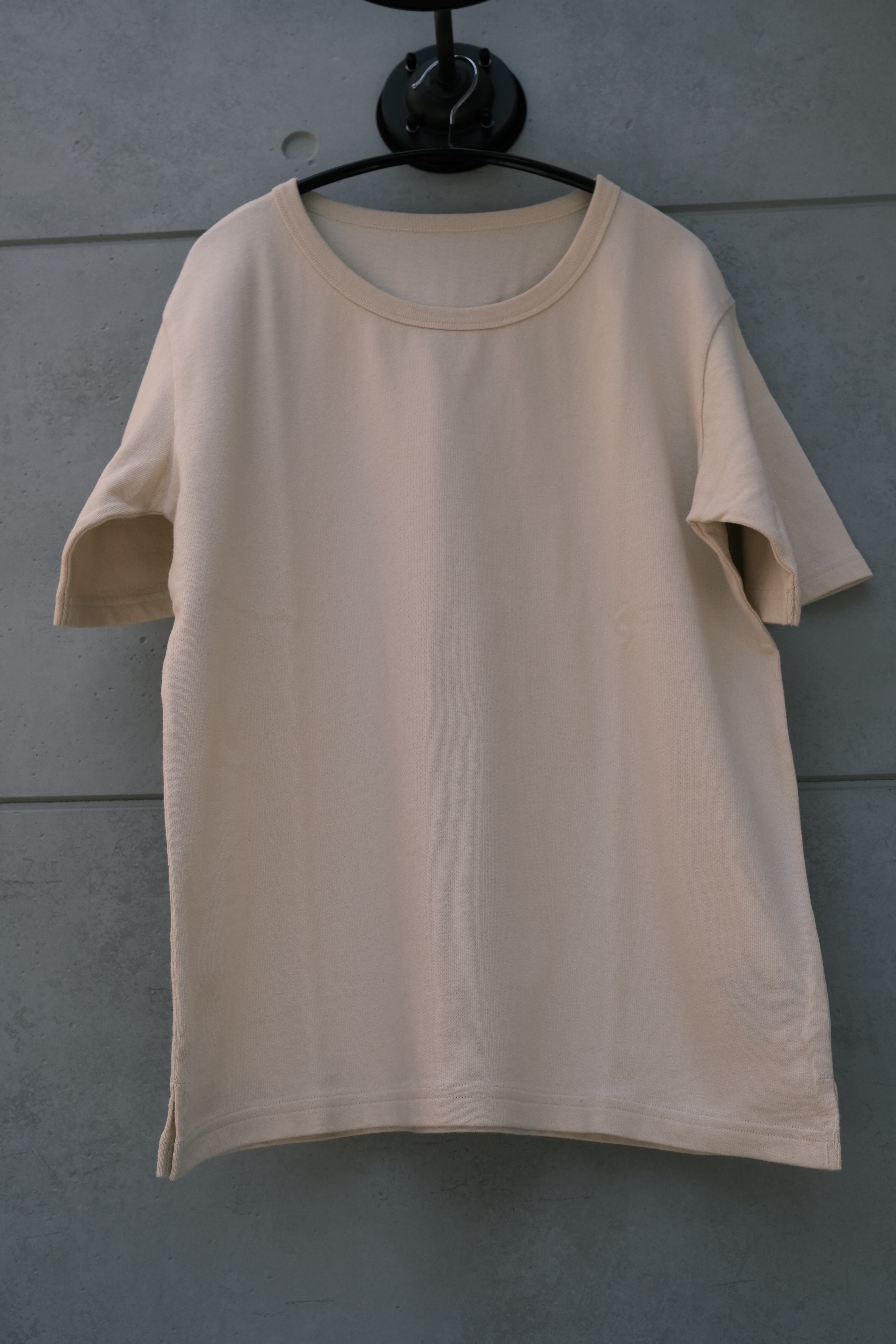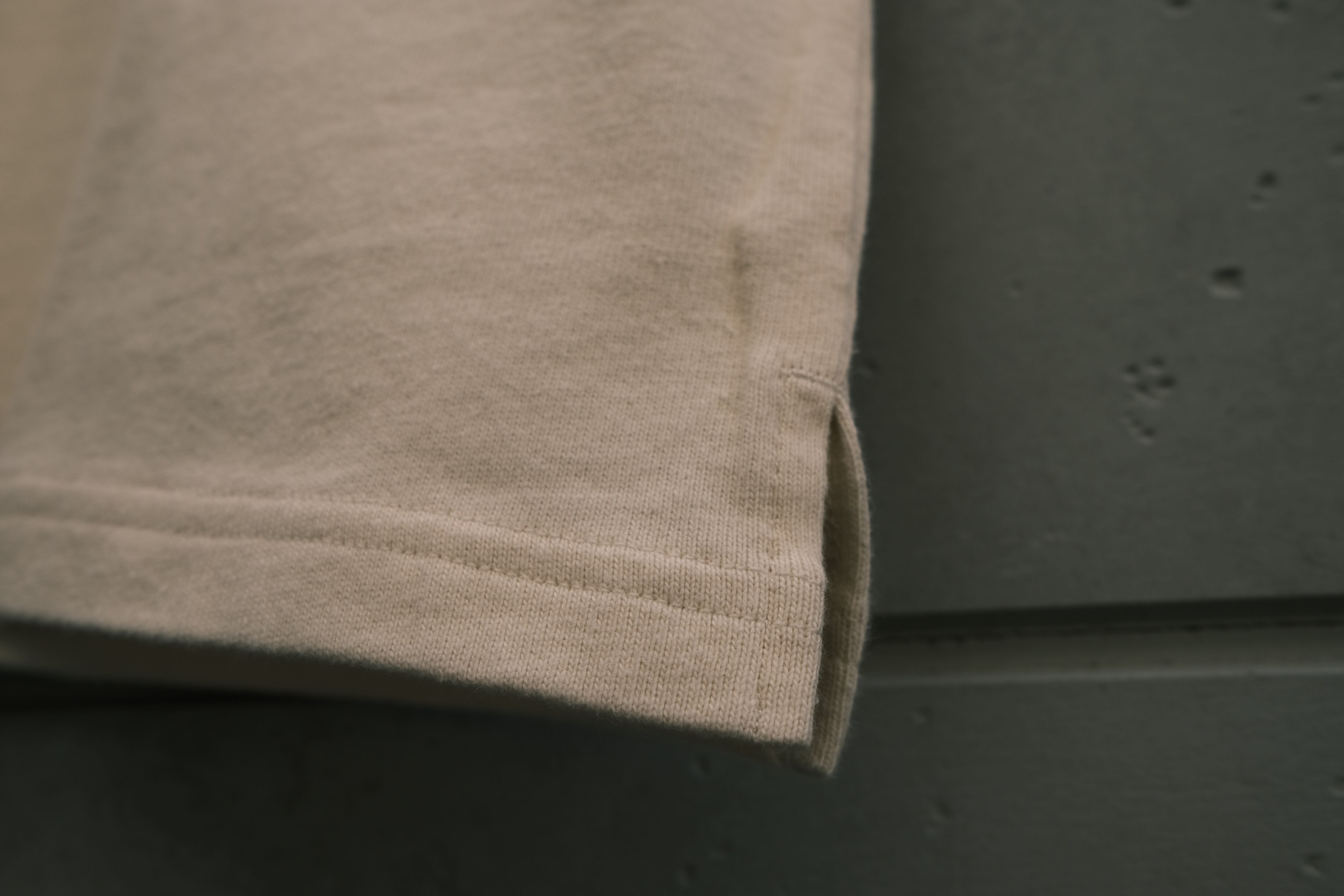 10番手の天竺オーガニックコットン(ヘビーオンス)を使用したアイテムで、ワンウォッシュを施し、縮みを防止しています。リブ編みのデザインによるゆったりとしたシルエットは、インナーや1枚着としても透けを気にせず快適に着用可能です。タグレス仕様により、ストレスフリーで部屋着やパジャマとしても活躍します。また、襟口にゆとりを持たせた仕様と、裾に5cmのスリットを施しました。このことで、イン&アウトでスタイルを楽しむことができます。ナチュラルな色合いが、綿100%の生地にぴったりの柔らかさを演出し、印象を和らげます。